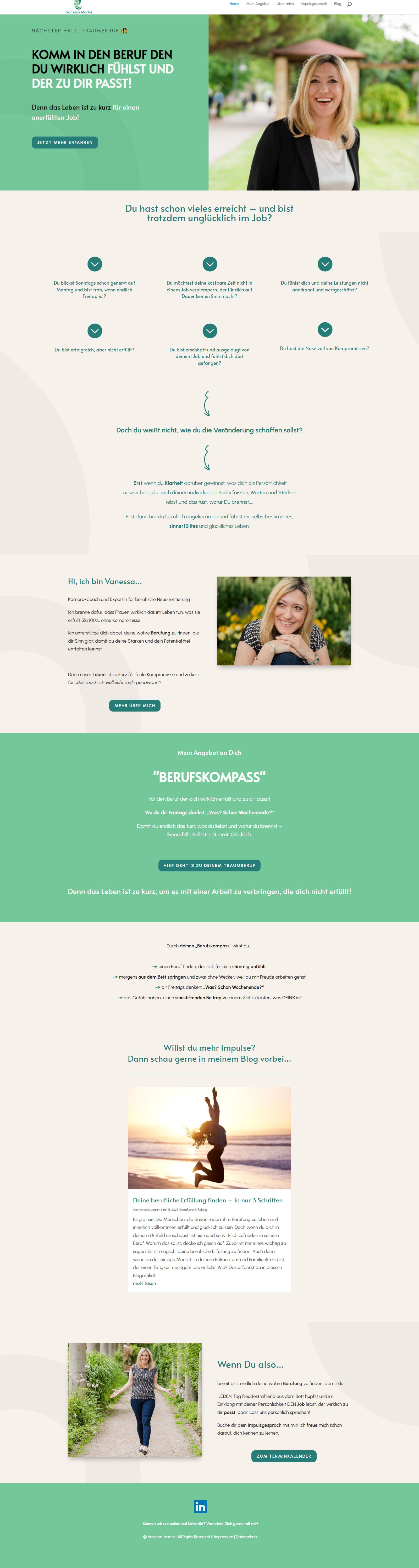 Vanessa hat mich über LinkedIn gefunden und hatte einen sehr klaren Wunsch: eine schlüsselfertige Website für ihr Coaching-Business. Ihre Positionierung war bereits klar – jetzt sollte das Ganze online genauso professionell wirken. Ich habe die Website von Grund auf aufgebaut und so strukturiert, dass BesucherInnen schnell verstehen, worum es geht und wie Vanessa arbeitet – inklusive einer Angebotsseite mit verschiedenen Paketen.