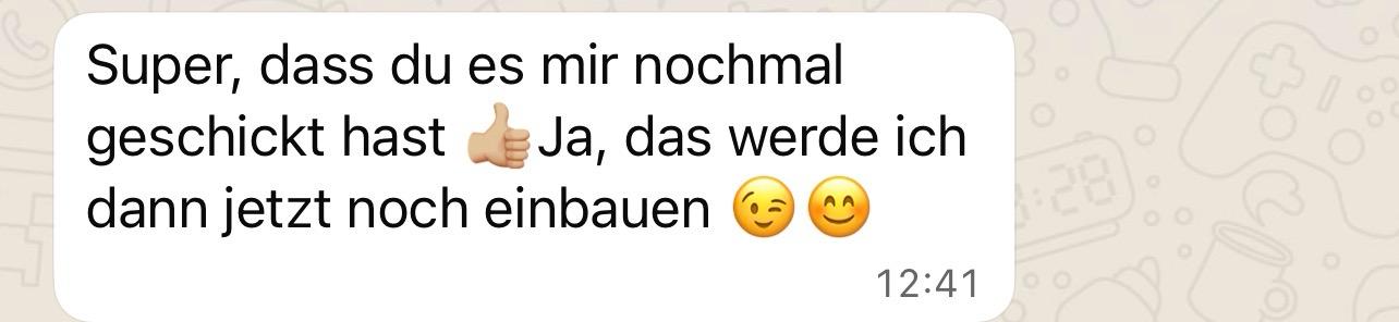 Ich freue mich riesig, sie gefunden zu haben. Ich durfte in meinem Tempo arbeiten und alle möglichen Fragen stellen. Mit einer Engelsgeduld geht sie auf alle Wünsche ein und bringt Struktur ins Vorgehen. Ich bekam dadurch sogar mehr Klarheit und Überblick über meine Arbeit.