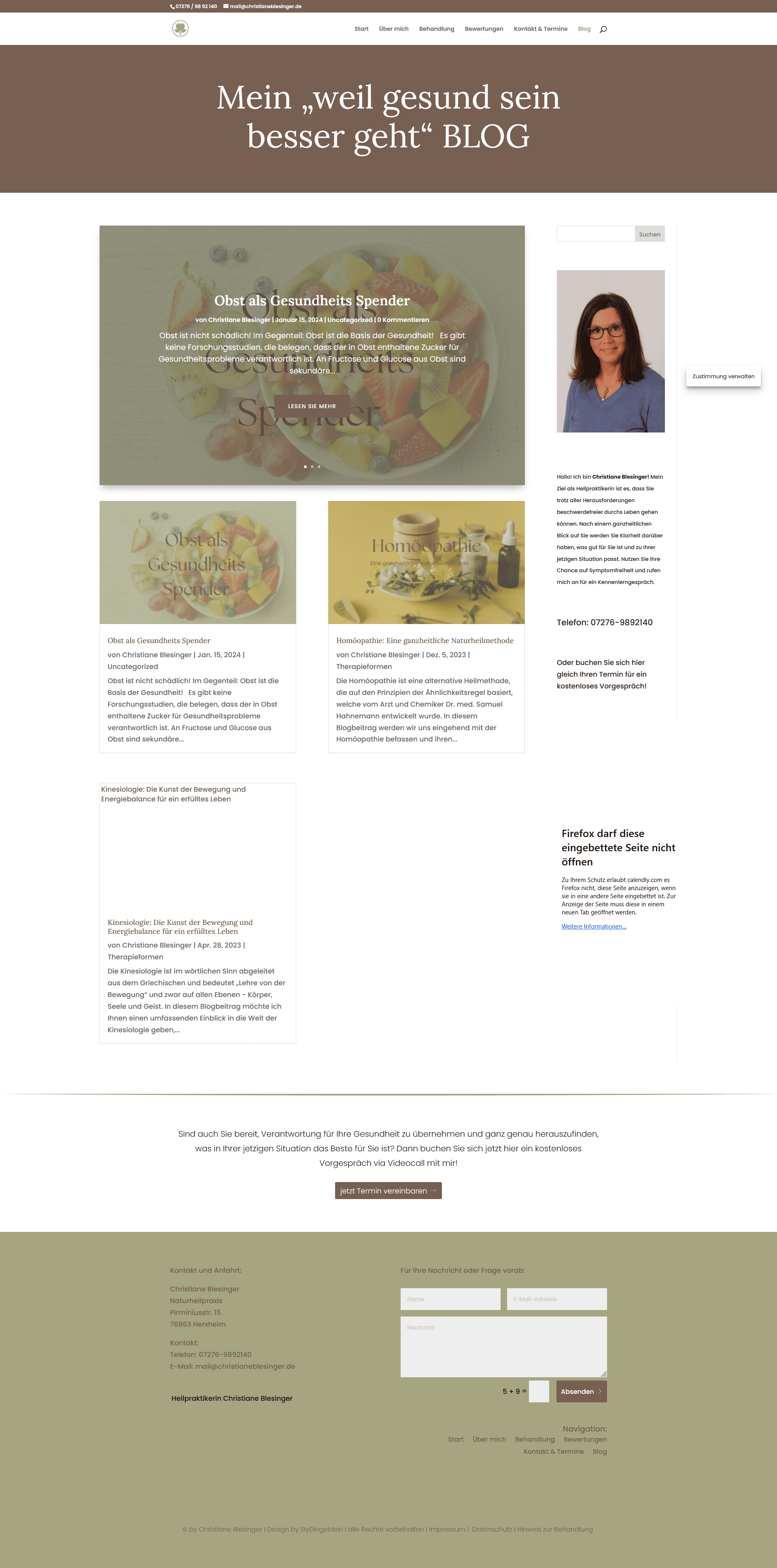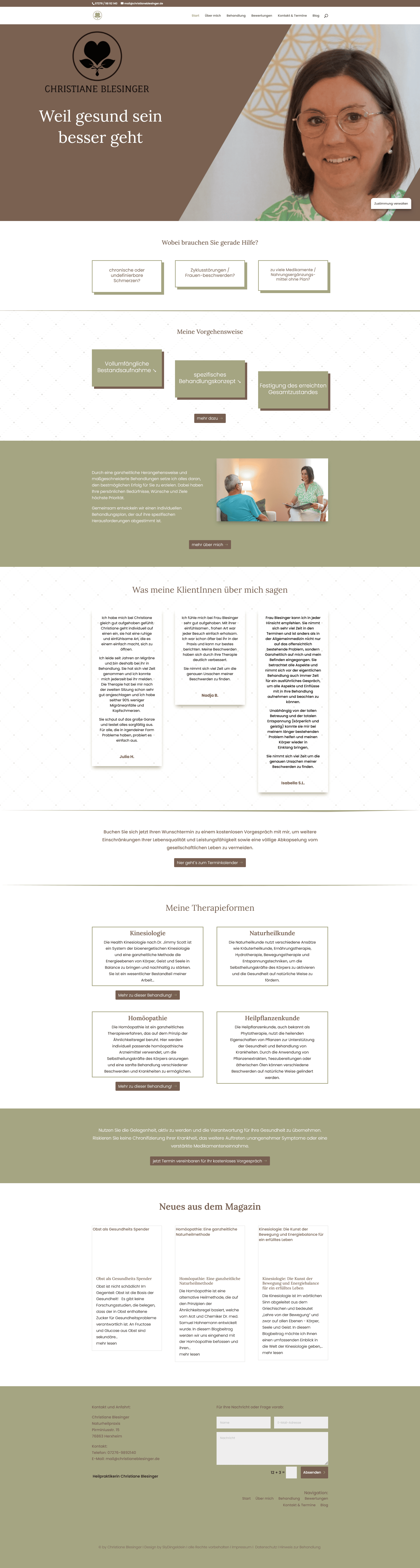 Christiane Blesinger ist Heilpraktikerin. Ihre alte Website war technisch und optisch überholt, hat keine Anfragen gebracht und hat sich nicht nach ihr angefühlt. Ziel war ein neuer Auftritt, der Vertrauen aufbaut und mehr KlientInnen anzieht – ohne Technik-Stress.
