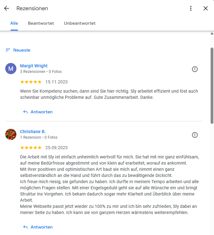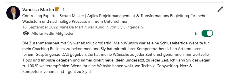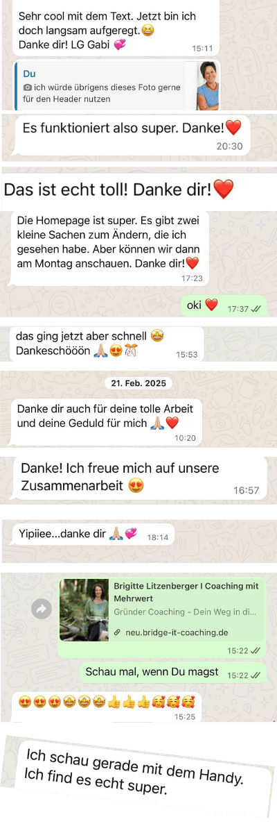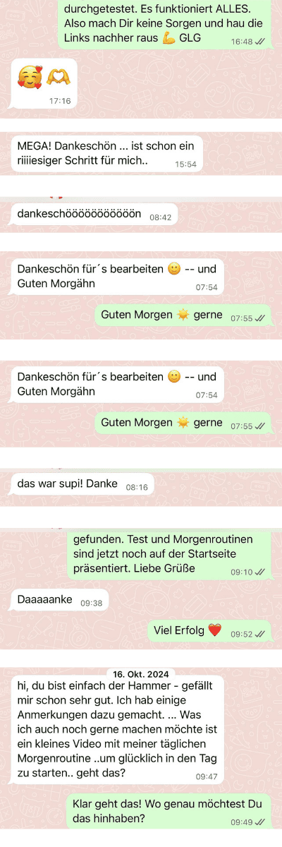 Hier findest Du ein paar Stimmen aus der Zusammenarbeit – teils als (Video) Testimonial, teils als kurze Nachrichten zwischendurch.